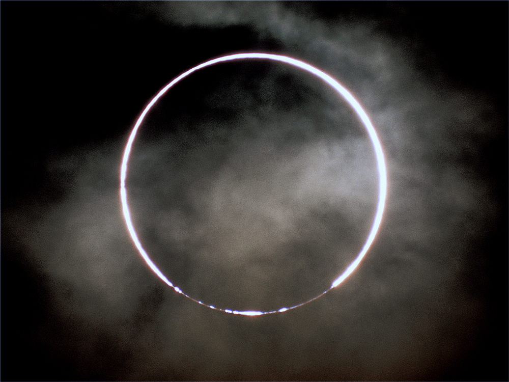 An annular eclipse occurs when the new Moon passes across the face of the Sun but never completely hides it; at mid-eclipse, there is a ring of brilliant sunlight around the Moon’s circumference. Indeed, the word annular derives from the medieval Latin annularis, meaning “pertaining to a ring.” When the Earth is closest to the Sun, and the Moon is at a distant point in its orbit, the latter appears too small to completely cover the solar disk (as it would during a total solar eclipse) and so the Moon is surrounded by the breathtaking “Ring of Fire.”